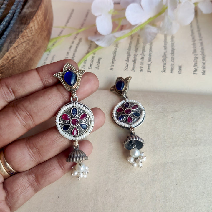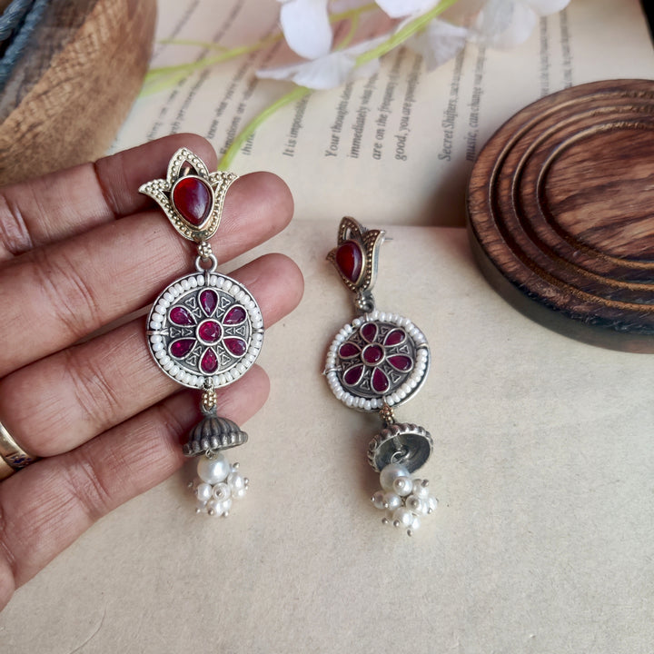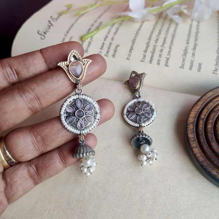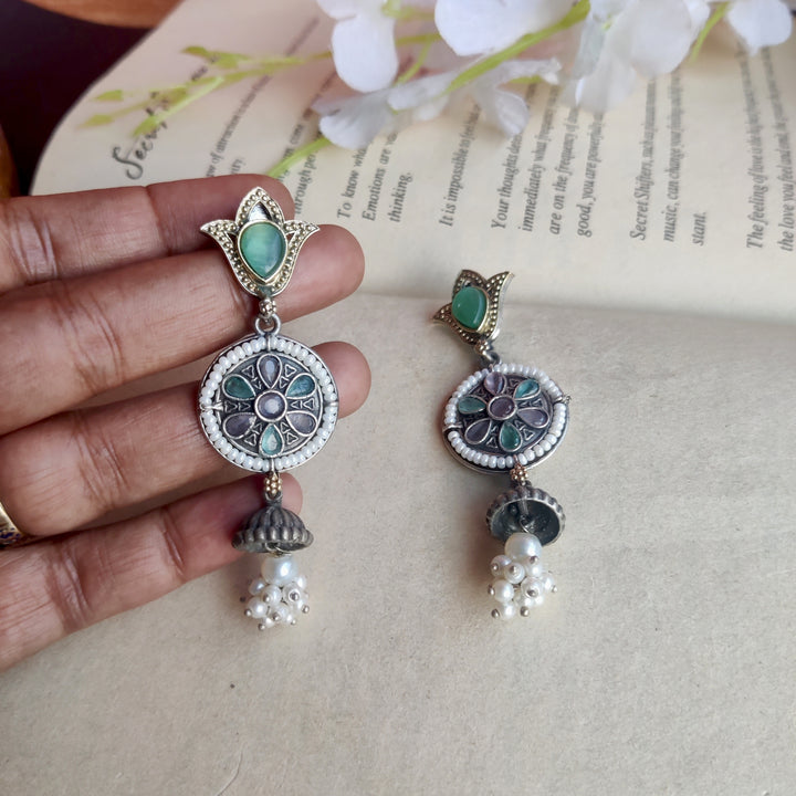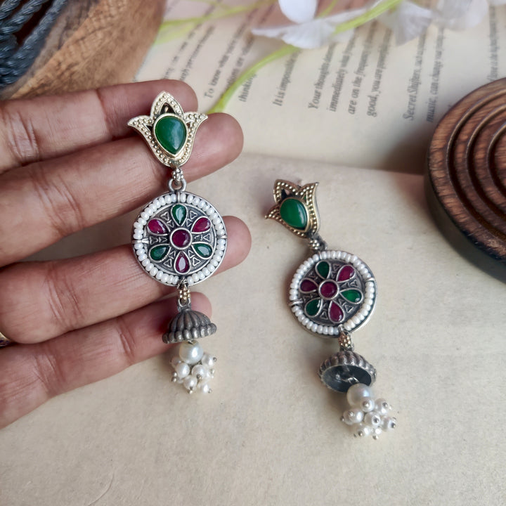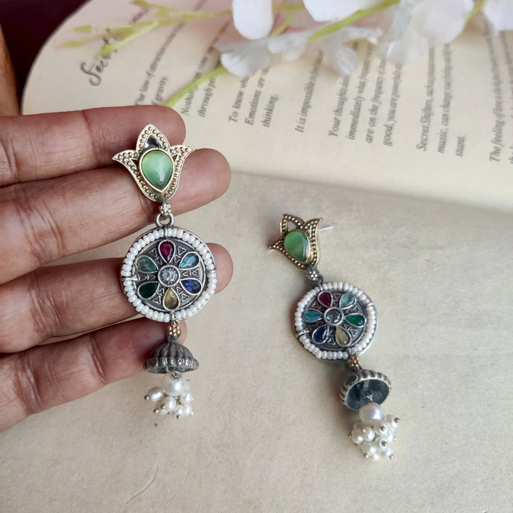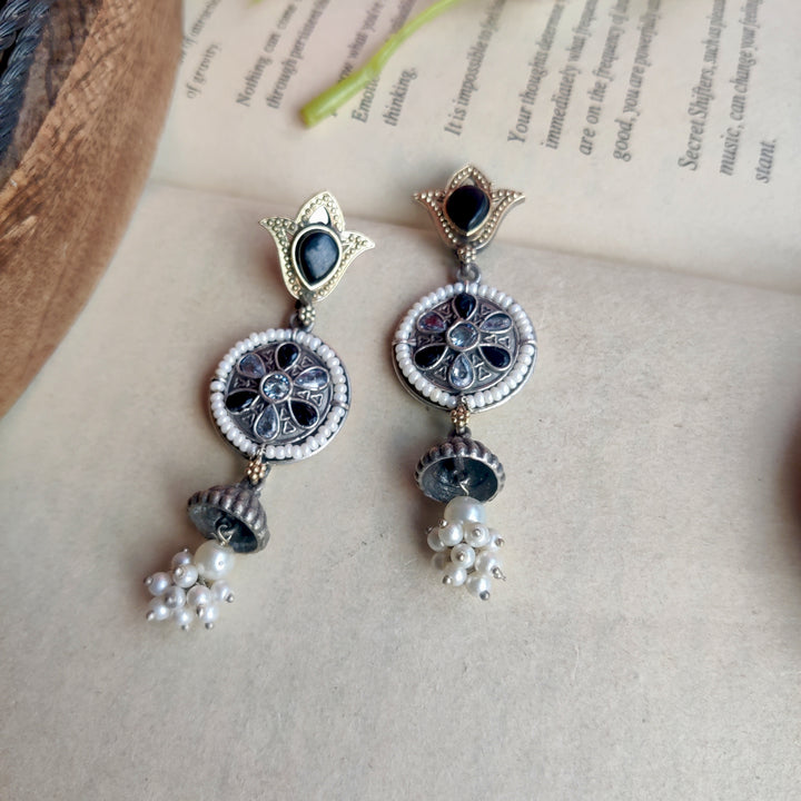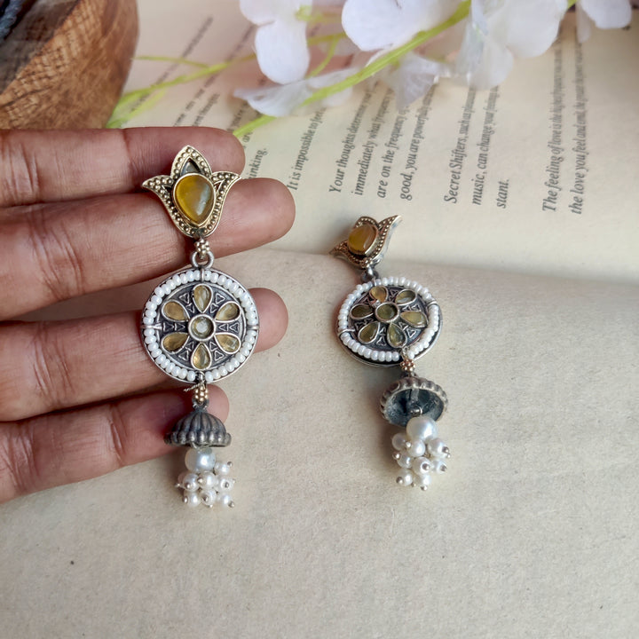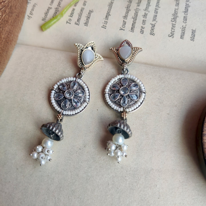 Silver–gold dual-tone danglers with a statement stone and delicate white pearls — elegant, versatile, and perfect for every special occasion.