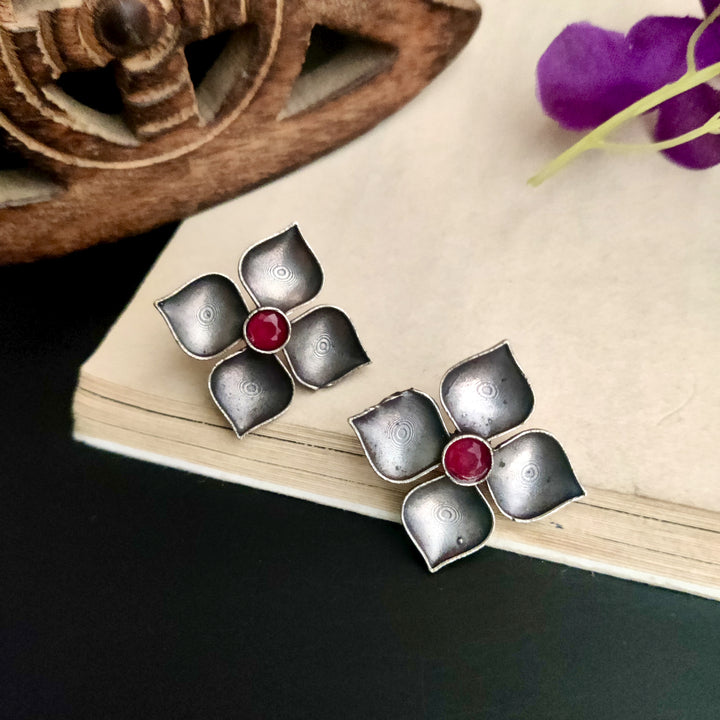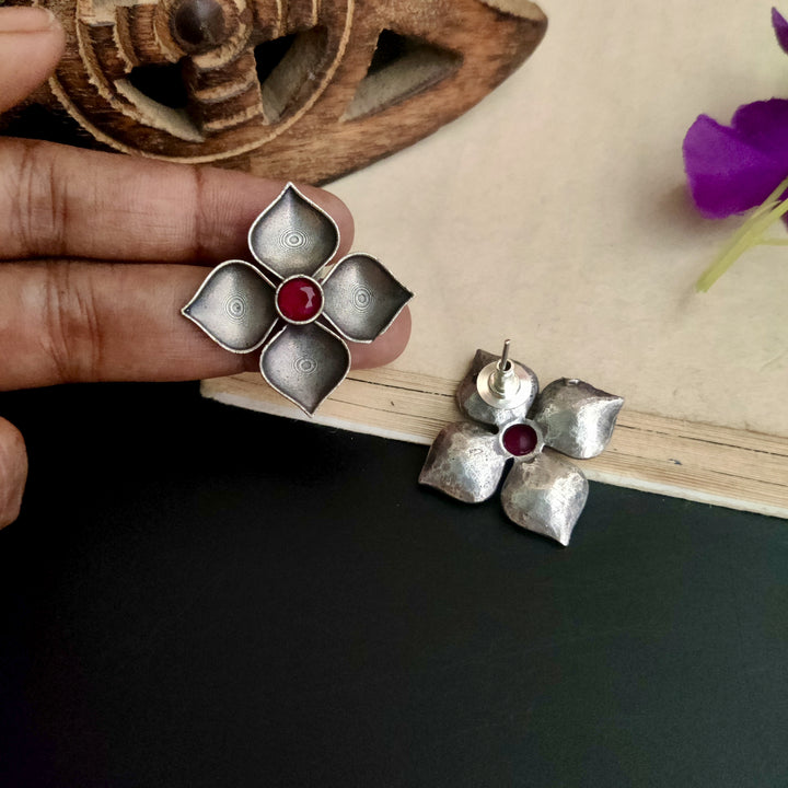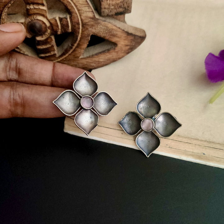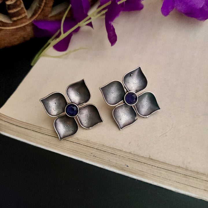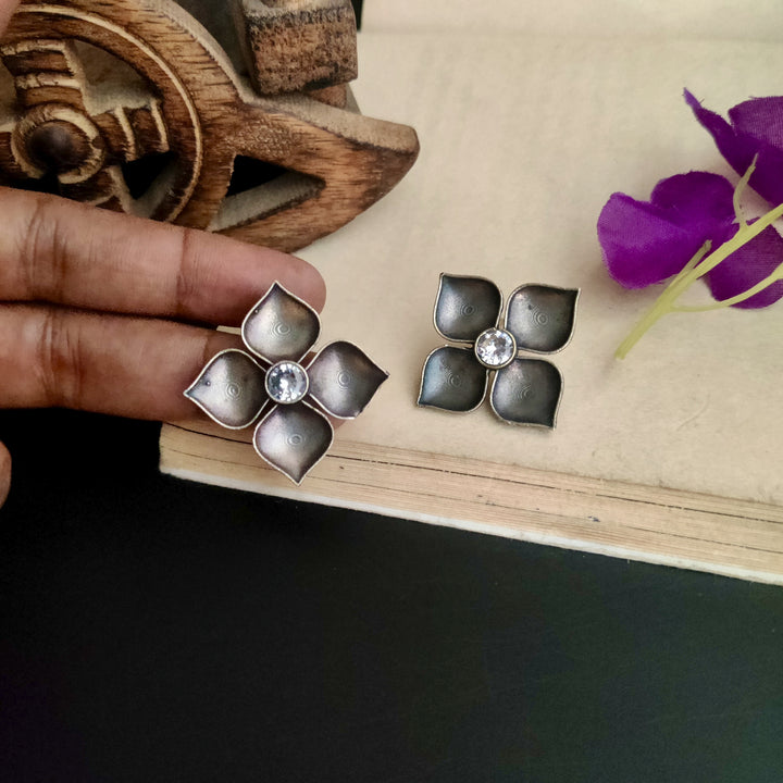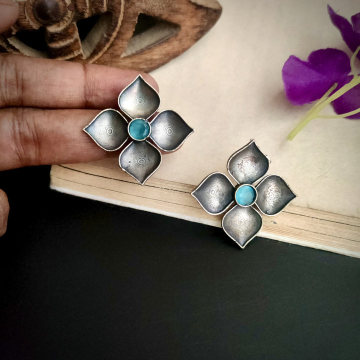 Silver Plated Tribal Style Square Shape Petal Design Oxidized Stud